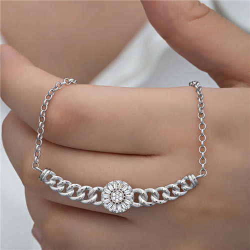 Silver Gourmet Chain Round Baguette Stone Women's Necklace The round baguette stone women's necklace, which will never go out of fashion, is reinterpreted in different styles with today's jewelry. The eye-catching sparkle of zircon will surround you. This silver and white round baguette stone women's necklace, which you and your loved ones will enjoy wearing, will also be one of the best gifts to share your love. The product is made of 925 sterling silver. Rhodium plated on silver. Rhodium plated products preserve their shine for a long time and oxidation is delayed. The average chain length is 45 cm. The stones on it are zircon and baguette. As with all silver necklaces, the silver gurmet chain baguette stone women's necklace is also handmade. Due to silver and precious stones, there may be a ± 10% deviation in the average product weight. Width: 1.00 cm Length: 5.00 cm Average Weight: 6.00 gr.