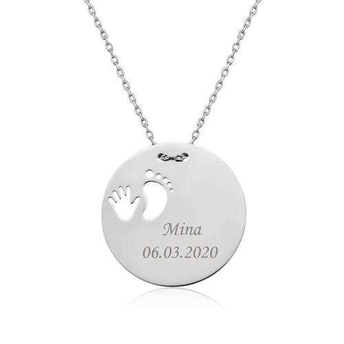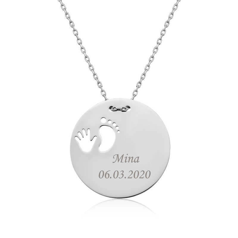 Silver Hand Footprint Newborn Necklace The baby hand footprint necklace, symbolizing innocent happiness, will be the most meaningful newborn gift for our most precious being in life, our only mother. You can have the name of the newborn baby and the date the baby was born into the world written on this necklace. With this special necklace, which will make your love for the person you love and value, you will not only make the new mother very happy but also crown her with a beautiful gift. All of our products are handmade. Due to silver and precious stones, there may be ± 10% deviation in product weight. Width: 2.20 cm Length: 2.20 cm Avg. Weight: 2.69 gr. Chain Length: 45.00 cm