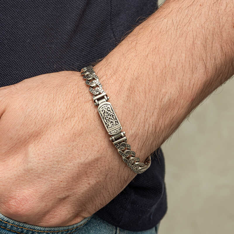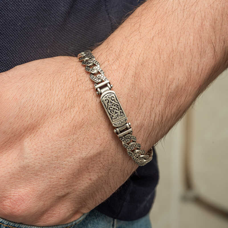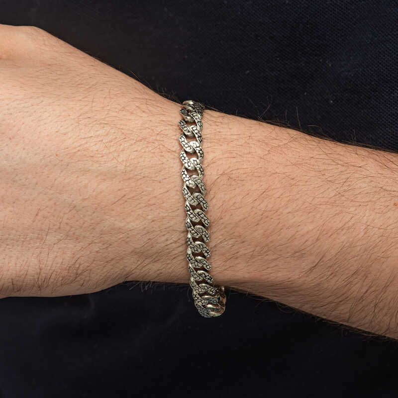 Silver Handmade Knitted Gurmet Men's Bracelet This stylish bracelet, carefully crafted by hand, preferred by stylish men, is a perfect accessory that complements both your modern and classic style. Made of 925% silver, this bracelet draws attention with its durability and shine. Offering a unique look with its special knitted design, this bracelet is ideal for adding elegance to every moment. Thanks to its lightweight structure, it provides comfort all day long. It is a stylish complement for daily use, invitations or special occasions. With different color and design options to match your own style, it is the best way to express yourself. Oxidized silver is coated. Oxidized silver bracelets preserve their shine for a long time. Like all silver bracelets, the silver handmade knitted gurmet men's bracelet is also produced by hand. Due to silver and precious stones, there may be ± 10% deviation in the average product weight. Bracelet Width: 1.00 cm Bracelet Length: 21 cm Average Weight: 27.00 gr.
