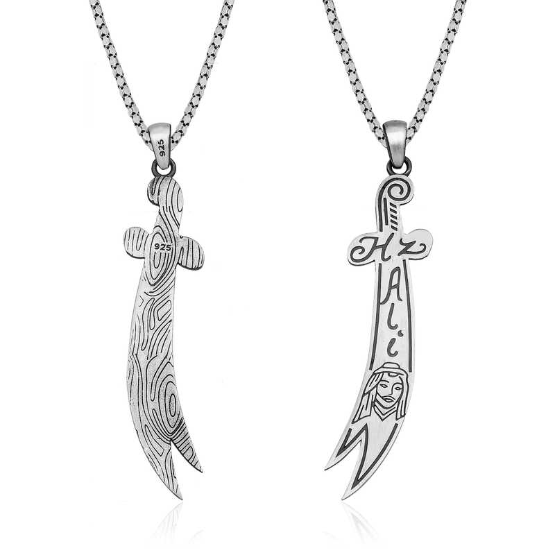 Silver Hz. Ali Zulfiqar Sword Necklace Hz. Ali showed great heroism in the Battle of Uhud. His sword broke while trying to protect the Prophet Muhammad (pbuh) in the battle. Seeing this, the Prophet gave him his own sword, Zulfiqar. With the sharpness of the sword, he split other swords in half and wrote epics in battles. Hz. Ali is now in battles with his Zulfiqar sword... It is known that the sword was taken to heaven after Hz. Ali's death. According to another narration, it is known to be between the Tigris and Euphrates rivers. The person who will rule the armies of Islam will own that sword and be the commander-in-chief of the armies. You can choose this stylish necklace as a birthday gift, Valentine's Day gift or a gift on special occasions. The necklace is made of 925 sterling silver. Oxide coating on silver. Oxide coating preserves its shine for a long time and gives the silver its black color. As with all necklaces, this silver Zulfiqar sword necklace is also entirely handmade. Due to silver and precious stones, there may be a ± 10% deviation from the average product weight. Width: 1.30 cm Length: 5.00 cm Average Weight: 10.50 gr. Chain Length: 55.00 cm