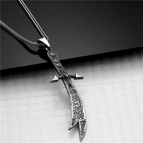 Silver Hz. Ali Zulfiqar Sword Necklace Hz. Ali showed great heroism in the Battle of Uhud. His sword broke while trying to protect the Prophet Muhammad (pbuh) in the battle. Seeing this, the Prophet gave him his own sword, Zulfiqar. With the sharpness of the sword, he split other swords in half and wrote epics in battles. Hz. Ali is now in battles with his Zulfiqar sword... It is known that the sword was taken to heaven after Hz. Ali's death. According to another narration, it is known to be between the Tigris and Euphrates rivers. The person who will rule the armies of Islam will own that sword and be the commander-in-chief of the armies. You can choose this stylish necklace as a birthday gift, Valentine's Day gift or a gift on special occasions. The necklace is made of 925 sterling silver. The silver has an oxidized coating. Silver necklaces with an oxidized coating preserve their shine for a long time. As with all necklaces, this silver Zulfiqar sword necklace is also entirely handmade. Due to silver and precious stones, there may be a ± 10% deviation from the average product weight. Width: 2.00 cm Length: 6.00 cm Average Weight: 11.50 gr. Chain Length: 55.00 cm