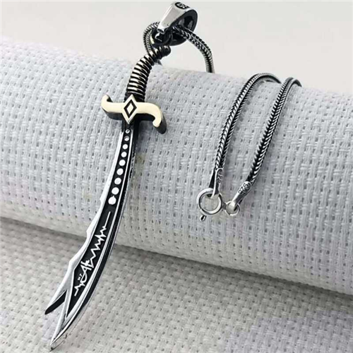 Silver Hz. Ali Zulfiqar Sword Necklace Hz. Ali showed great heroism in the Battle of Uhud. His sword broke while trying to protect the Prophet Muhammad (pbuh) in the battle. Seeing this, the Prophet gave him his own sword, Zulfiqar. With the sharpness of the sword, he split other swords in half and wrote epics in battles. Hz. Ali is now in battles with his Zulfiqar sword... It is known that the sword was taken to heaven after Hz. Ali's death. According to another narration, it is known to be between the Tigris and Euphrates rivers. The person who will rule the armies of Islam will own that sword and be the commander-in-chief of the armies. You can choose this stylish necklace as a birthday gift, Valentine's Day gift or a gift on special occasions. The necklace is made of 925 sterling silver. The silver has an oxidized coating. Silver necklaces with an oxidized coating preserve their shine for a long time. As with all necklaces, this silver Zulfiqar sword necklace is also entirely handmade. Due to silver and precious stones, there may be a ± 10% deviation from the average product weight. Width: 1.10 cm Length: 5.50 cm Chain Length: 55.00 cm Average Weight: 11.70 gr.