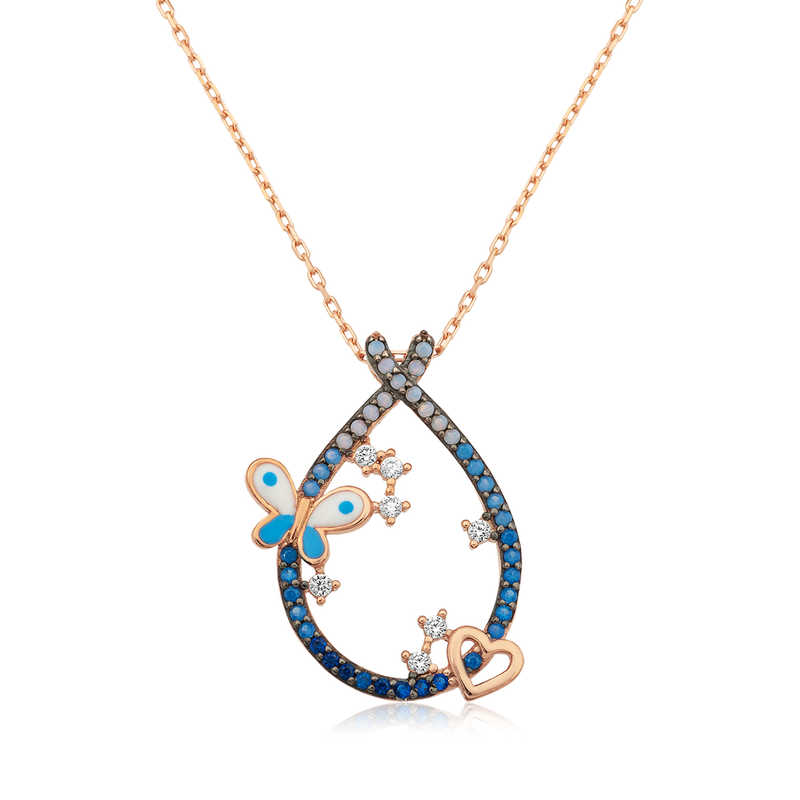 Silver Heart and Butterfly Drop Necklace You will love using this necklace, which resembles stars with its sparkling stones, that you can choose in everyday life, special occasions and nights. The silver drop necklace with a butterfly and a heart that will never go out of style is waiting for you, appealing to all women who want to create a stylish look. Silver drop necklace with a heart and a butterfly with blue stones is a perfect option for a birthday gift, Valentine's Day gift or as a gift for mothers on special occasions. The drop women's necklace with a heart and a butterfly is made of 925 sterling silver. Rose plated silver. Rose plated women's necklaces preserve their shine for a long time, turn the silver to a pink color and delay oxidation. The stones on it are zircon. The chain length is approximately 45 cm. Like all women's necklaces, the silver heart and butterfly drop women's necklace is produced by hand. Due to silver and precious stones, there may be a ± 10% deviation in the average product weight. Width: 1.90 cm Length: 2.20 cm Average Weight: 2.55 gr. Chain Length: 45 cm