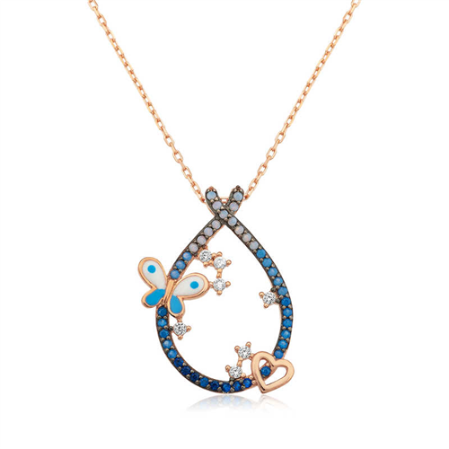 Silver Heart and Butterfly Drop Necklace You will love using this necklace, which resembles stars with its sparkling stones, that you can choose in everyday life, special occasions and nights. The silver drop necklace with a butterfly and a heart that will never go out of style is waiting for you, appealing to all women who want to create a stylish look. Silver drop necklace with a heart and a butterfly with blue stones is a perfect option for a birthday gift, Valentine's Day gift or as a gift for mothers on special occasions. The drop women's necklace with a heart and a butterfly is made of 925 sterling silver. Rose plated silver. Rose plated women's necklaces preserve their shine for a long time, turn the silver to a pink color and delay oxidation. The stones on it are zircon. The chain length is approximately 45 cm. Like all women's necklaces, the silver heart and butterfly drop women's necklace is produced by hand. Due to silver and precious stones, there may be a ± 10% deviation in the average product weight. Width: 1.90 cm Length: 2.20 cm Average Weight: 2.55 gr. Chain Length: 45 cm