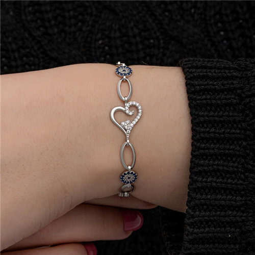 Silver Heart Evil Eye Women's Bracelet Heart is the way to express love with all its purity, naturalness and sincerity... You can make your lover happy by gifting this special design created to express eternal love on his birthday, Valentine's Day or special occasions... This bracelet full of love is made of 925 sterling silver. The stones on the silver heart evil eye women's bracelet are zircon. This women's silver bracelet is rhodium plated. Rhodium-plated bracelets preserve their shine for a long time and oxidation is delayed. Like all silver bracelet models, this silver heart evil eye women's bracelet model is produced entirely by handmade. Due to silver and precious stones, there may be a ± 10% deviation from the average product weight. Bracelet Heart Width: 2.00 cm Bracelet Heart Height: 1.40 cm Bracelet Length: 19 cm Average Weight: 6.50 gr.