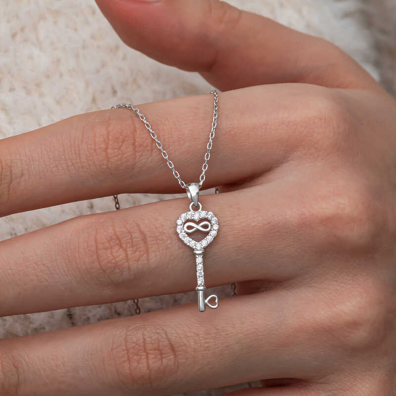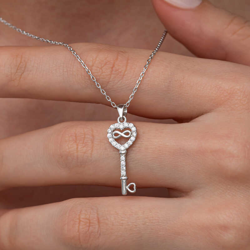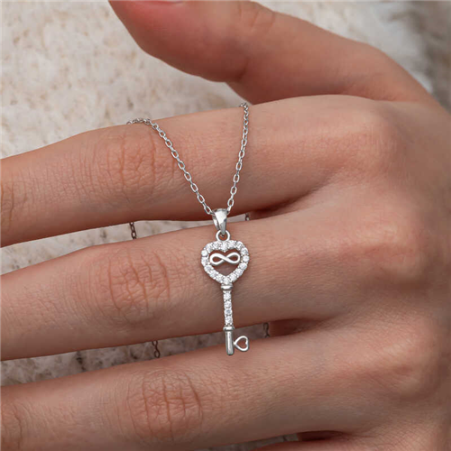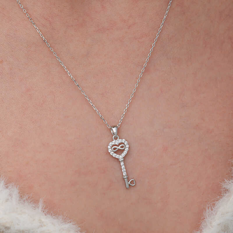 Silver Heart Infinity Key Women's Necklace Heart Key Women's Necklace is generally considered a symbol of love, commitment and a special relationship. While the heart represents love and emotional bond, the key symbolizes trust, secrets and opening the doors to happiness. The infinity symbol represents the existence of an eternal bond or relationship. It expresses permanent love and commitment in relationships. This stylish necklace is a perfect option for a birthday gift, Valentine's Day or special occasions. The necklace is made of 925 sterling silver. Rhodium plated on the silver. Due to silver and precious stones, there may be ± 10% deviation from the average product weight. Width: 0.80 cm Length: 2.50 cm Avg. Weight: 2.00 gr. Chain Length: 45.00 cm