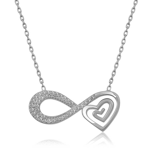 Silver Infinity Necklace with Heart One of the best ways to express your love that will last forever is to gift your loved one silver jewelry with a heart and infinity symbol. The infinity symbol can be one of the meaningful gifts that can be received on special occasions such as wedding anniversaries or Valentine's Day as a symbol of eternal love and loyalty. The infinity women's necklace with heart is made of 925 sterling silver. Rhodium plated silver. Rhodium plated silver women's necklace models preserve their shine for a long time and oxidation is delayed. The stones on the necklace are zircon. The silver heart infinity women's necklace is entirely handmade. Like all women's silver necklace models, the silver heart infinity women's necklace is also handmade. Due to silver and precious stones, there may be a ± 10% deviation in the specified product weight. Width: 2.50 cm Length: 1.00 cm Average Weight: 2.61 gr. Chain Length: 45 cm