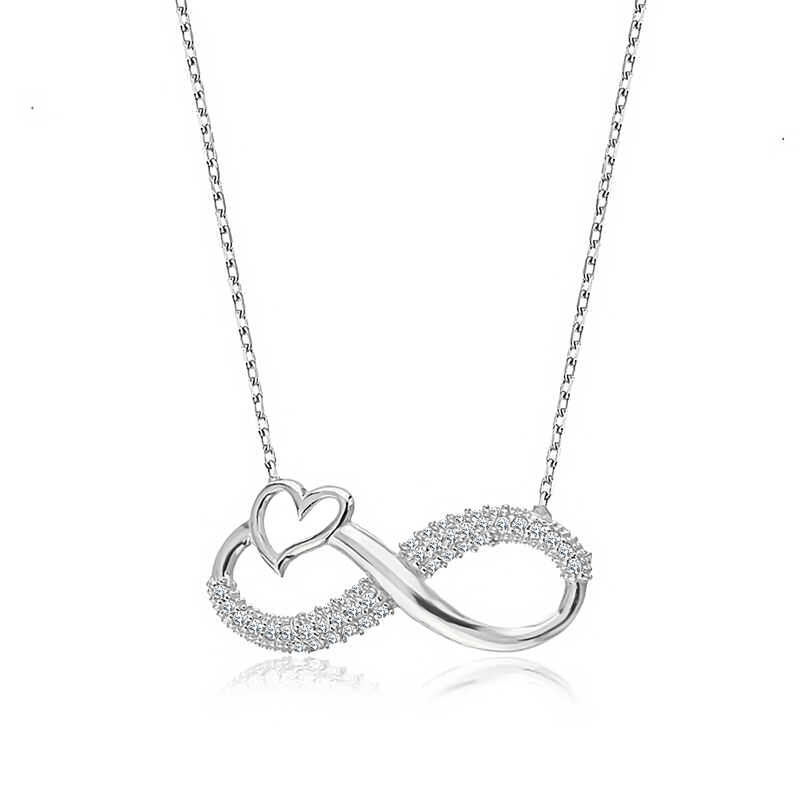 Silver Heart Infinity Women's Necklace Heart is the way to express love with all its purity, naturalness and sincerity... You can make your beloved one happy by gifting this special design created to express eternal love on her birthday, Valentine's Day or special occasions... This necklace model full of love is made of 925 sterling silver. The stones on the silver heart infinity women's necklace are zircon. This women's silver necklace is rhodium plated. Rhodium plated silver necklace models preserve their shine for a long time and delay oxidation. Like all silver necklaces, this silver heart infinity women's necklace model is also handmade. Due to silver and precious stones, there may be a ± 10% deviation in the average product weight. Necklace Width: 2.90 cm Necklace Length: 1.30 cm Average Weight: 2.50 gr. Chain Length: 45 cm