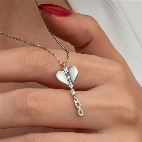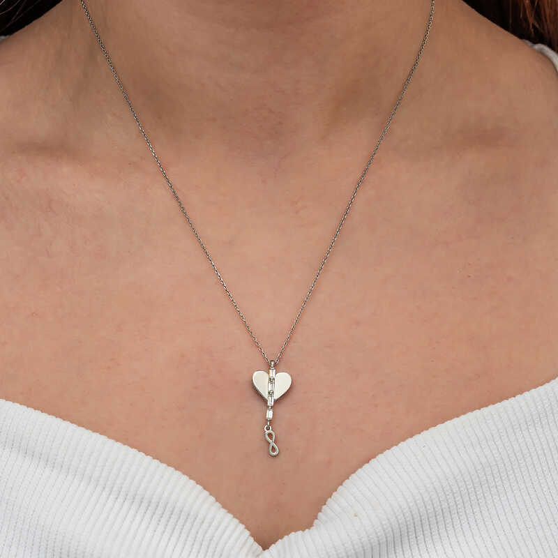 Silver Heart Infinity Women's Necklace While the heart symbol represents love and emotional bond, the infinity symbol expresses continuity and eternal love. This necklace is a great gift option to emphasize your special moments and your commitment to your loved ones. The heart infinity necklace, which you and your loved ones will enjoy wearing, will be one of the best gifts for your loved one. Rhodium plated on silver. Rhodium-plated necklaces preserve their shine for a long time and oxidation is delayed. Due to silver and precious stones, there may be ± 10% deviation in the average product weight. Width: 1.10 cm Length: 2.50 cm Avg. Weight: 2.00 gr. Chain Length: 45.00 cm