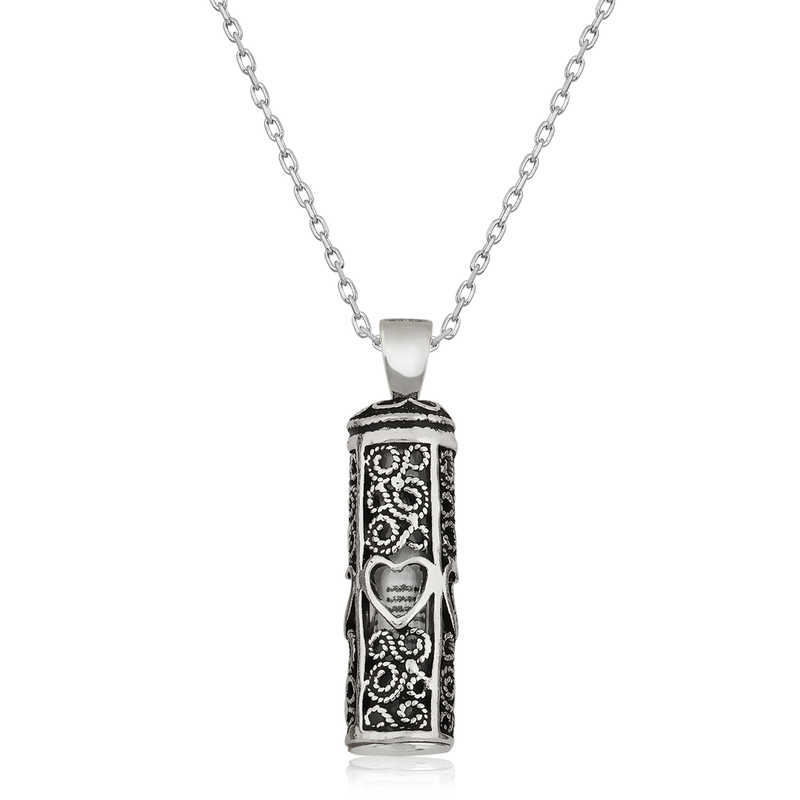 Silver Heart Patterned Cevşen-ül Kebir Necklace The heart symbol has always been the symbol of unconditional love and passion. In religious teachings, the power of the heart is limitless. Because the heart is the house of the Creator and our gateway to reality that opens to the universe. You can choose the heart patterned cevşen-ül kebir necklace, which is a spiritual armor for humans, as a birthday gift, Valentine's Day gift or a gift for mothers on special occasions. The heart patterned cevşenül kebir women's necklace model is made of 925 sterling silver. Oxidized silver is coated. Oxidized silver necklaces preserve their shine for a long time and delay tarnishing. Like all necklace models, this silver heart patterned cevşen-ül kebir necklace model is produced entirely by hand. The average chain length is 45 cm. Due to silver and precious stones, there may be a ± 10% deviation in the average product weight. Width: 0.80 cm Length: 3.20 cm Average Weight: 6.00 gr.