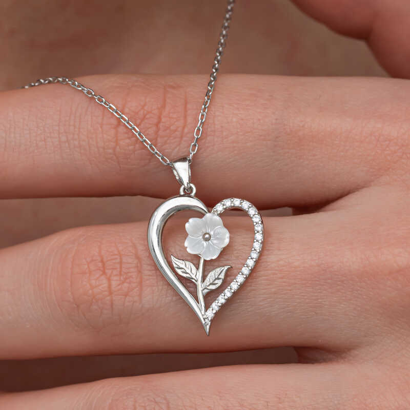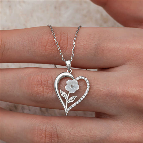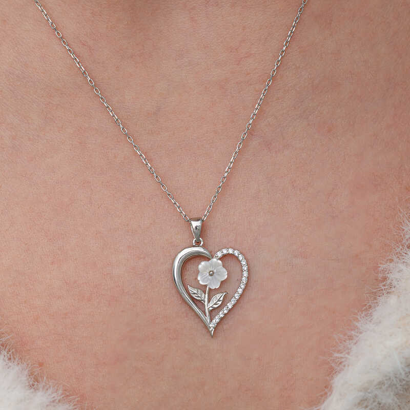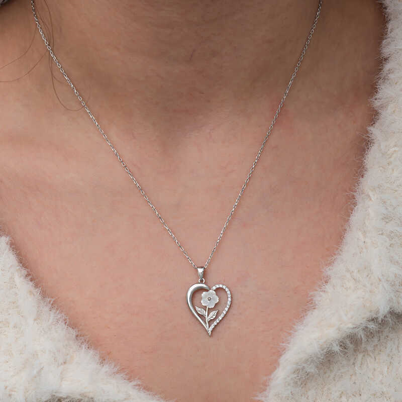 Silver Heart White Rose Women's Necklace The white rose necklace with heart carries a special meaning because the white rose symbolizes pure and innocent love and the heart figure represents love and devotion. This stylish necklace is a perfect option for a birthday gift, Valentine's Day or special occasions. The necklace is made of 925 sterling silver. Rhodium plated on the silver. Due to silver and precious stones, there may be ± 10% deviation from the average product weight. Width: 1.50 cm Length: 2.00 cm Avg. Weight: 2.60 gr. Chain Length: 45.00 cm