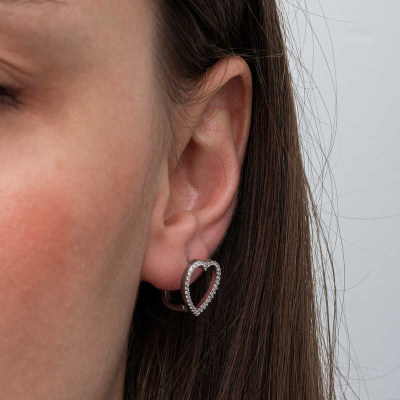 Silver Heart Women's Earrings Let your love come to life on the skin of the woman you love with the heart women's earrings that express love with their heart pattern. This stylish earring model is made of 925 sterling silver. The silver heart women's earrings, which you and your loved ones will enjoy wearing, are a perfect option as a birthday gift, Valentine's Day gift or a gift for mothers on special occasions. The silver is rhodium-plated. Rhodium-plated women's earrings preserve their shine for a long time and oxidation is delayed. The stones on it are zircon. Like all silver women's earrings, the silver heart women's earring is also handmade. Due to silver and precious stones, there may be a ± 10% deviation in the average product weight.Width: 1.50 cmLength: 1.50 cmAverage Weight: 3.40 gr.
