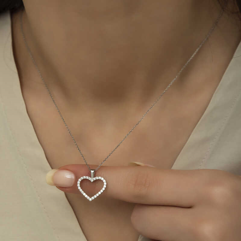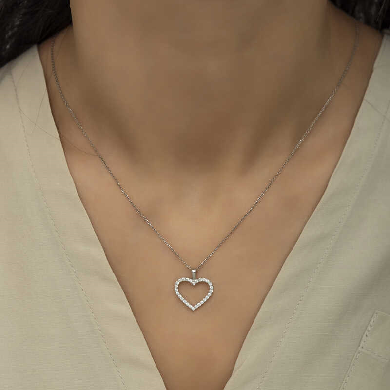 Silver Heart Women's Necklace This wonderfully designed heart necklace model, with all-stone heart pattern, is made of 925 sterling silver. Heart-designed necklaces evoke love. Therefore, a silver heart necklace can also be a nice gift option. Zircon stones are used on this necklace. Rhodium plating is used to delay oxidation of the silver and to preserve its shine for a long time. The average length of the completely silver chain is 45 cm. This women's heart necklace model is handmade like other silver women's heart necklace models. Due to silver and precious stones, there may be ± 10% deviation in the average product weight. Width: 1.50 cm Length: 1.60 cm Avg. Weight: 1.50 gr. Chain Length: 45.00 cm