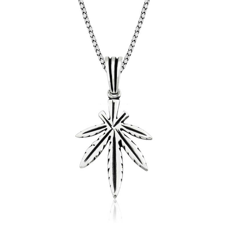 Silver Cannabis Leaf Necklace Cannabis is a plant with a soothing and stimulating effect. This necklace was inspired by the cannabis leaf. This stylish necklace model is a perfect choice for a birthday gift, Father's Day, or special occasions. The Cannabis Leaf Necklace model is made of 925 sterling silver. The silver has an antique pattern and an oxidized coating. Thanks to this coating, silver necklaces maintain their first-day appearance for a long time. As with all silver necklace models, the Silver Cannabis Leaf Necklace model is produced entirely by hand. Due to silver and precious stones, there may be a ± 10% deviation from the average product weight. Width: 2.20 cm Length: 4.00 cm Average Weight: 10.00 gr. Chain Length: 55.00 cm