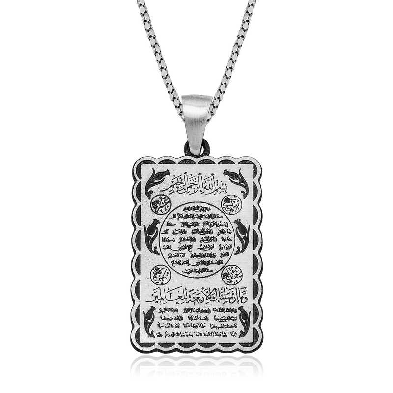 Silver Hilye-i Şerif Necklace Hilya is a decorative art form developed by Ottoman calligraphers in the 17th century. While literal meanings of "ornament," "adornment," and "beauty," hilye also carries meanings such as "form," "adjective," and "creation." A total of eight sections, the hilye consists of four main parts: the "chief position," "navel," "sash," and "skirt." The other four sections serve as complements to the main sections. The chief position; located at the top of the hilye, this section contains the Basmala. The Sash; this section contains a short verse about Muhammad. This verse is usually found in verse 107 of Surah Anbiya, meaning "We sent only as a mercy to the worlds." However, in some hilyahs, the hadith "levlâke levlâk lema halakatu'l-eflâk," meaning "O my beloved, if it were not for you, I would not have created the universe," was also included in this section. The navel is the section where the longest section of the hilyah is placed, and is round or oval. It is the section containing narratives about Muhammad. The skirt is the continuation of the hilyah text that does not fit within the navel. The last line of the text includes the name of the hilyah writer and the date the hilyah was written. The other sections, these four sections outside the main sections, are in the form of four circles around the navel. These four sections, where the four caliphs are mostly written, sometimes include the four names of Muhammad. You can enjoy this necklace with spiritual meaning and gift it to your loved ones. The necklace is made of 925 sterling silver. Oxidized silver is coated. Necklace models with oxidized coating have an authentic appearance. Like all necklaces, the silver Hilye-i Sharif necklace is also handmade. Due to silver and precious stones, there may be ± 10% deviation in product weight. Width: 2.20 cm Length: 3.50 cm Average Weight: 12.50 gr. Chain Length: 55.00 cm