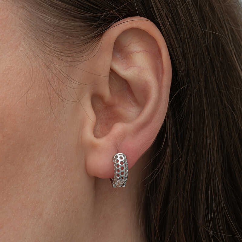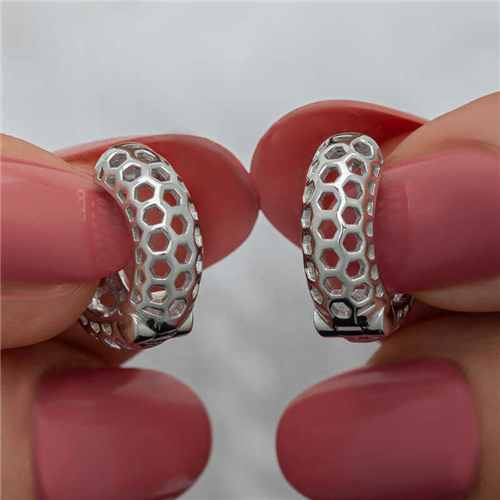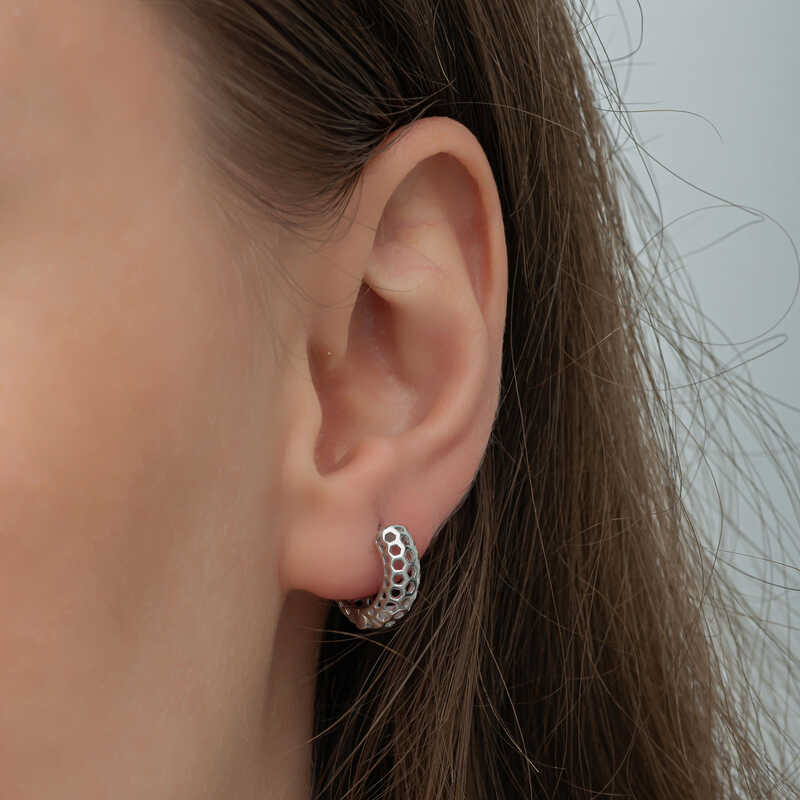 Silver Honeycomb Patterned Hoop Women's EarringsYou can use these stylish and sporty hoop earrings very easily in everyday life. Silver hoop women's earrings are a perfect option for a birthday gift, a Valentine's Day gift or a gift for mothers on special occasions. Silver hoop women's earrings are made of 925 sterling silver. Rhodium plated on the silver. Rhodium plated silver honeycomb patterned hoop women's earrings preserve their shine for a long time and oxidation is delayed. As with all women's earrings, silver hoop women's earrings are handmade. Due to silver and precious stones, there may be ± 10% deviation in the average product weight.Earring Thickness: 0.50 cmEarring Diameter: 1.50 cmAvg. Weight: 3.50 gr.