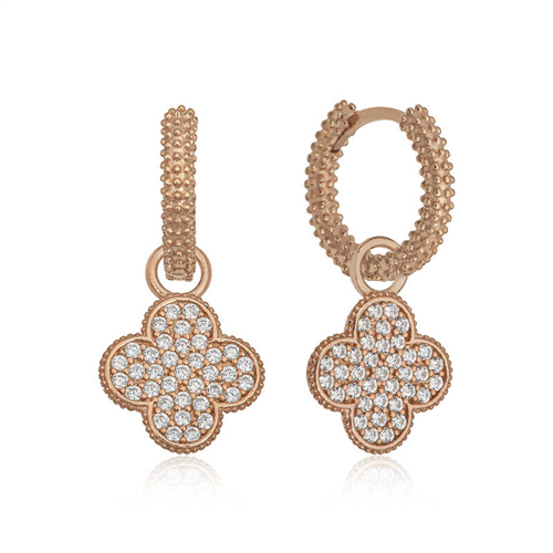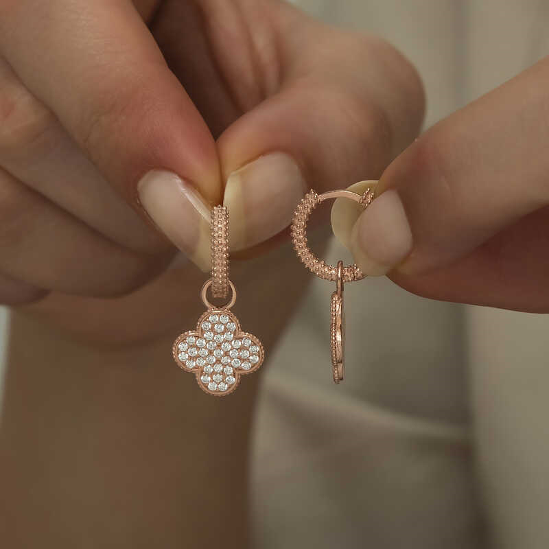 Silver Hoop Clover Women's EarringsThe four-leaf clover is considered a symbol of good luck in all cultures. Each of the four leaves of the clover has a different meaning. The first leaf symbolizes hope, the second symbolizes faith, the third symbolizes love, and the fourth leaf symbolizes luck. This specially designed women's earring model featuring a clover is made of 925 sterling silver. This elegant earring will be a very stylish gift option for young lovers on special occasions. The silver clover women's earrings have rose plating. Rose-plated silver products preserve their shine for a long time and delay oxidation. The silver clover women's earrings will be one of the most beautiful gifts that your loved ones will enjoy wearing as much as you. As with all our silver women's earring models, the silver clover women's earrings are handmade. Due to silver and precious stones, there may be ± 10% deviation in the specified product weight.Width: 1.30 cmLength: 2.70 cmAvg. Weight: 4.30 gr.