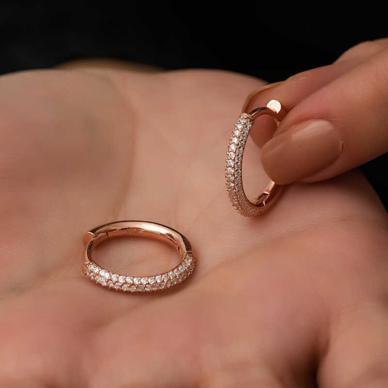 Silver Hoop Earrings for WomenYou will love using this earring, which stands out with its stylish design in everyday life and on special occasions. Appealing to all women, these timeless silver hoop earrings for women are waiting for you. Silver rose plated with white stones are a perfect option as a birthday gift, Valentine's Day gift or a gift for mothers on special occasions. Silver earrings are made of 925 sterling silver. Rose plated silver. Rose plated silver earring models preserve their shine for a long time and oxidation is delayed. Like all women's earrings, this earring model is produced by hand. Due to silver and precious stones, there may be a ± 10% deviation in the average product weight.Earring Thickness: 0.40 cmEarring Diameter: 2.00 cmAverage Weight: 4.80 gr.