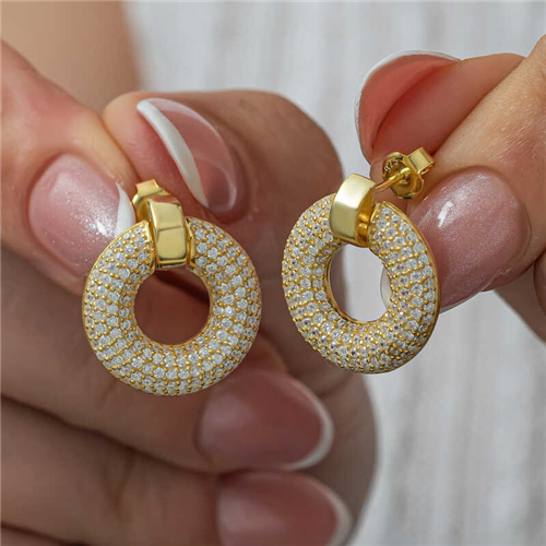 Silver Hoop Gold Women's EarringsDazzling earrings with hoop details help you maintain your elegance and elegance. Designed with innovative touches, this earring is a nice product to accompany your combinations on special days and nights. You can add this stylish earring to your jewelry collection. Hoop women's earrings are made of 925 sterling silver. Gold plated on silver. The stones on it are zircon. Like other earrings, silver hoop women's earrings are handmade. Due to silver and precious stones, there may be ± 10% deviation from the average product weight.Earring Width: 1.80 cmEarring Length: 1.90 cm Avg. Weight: 5.85 gr.