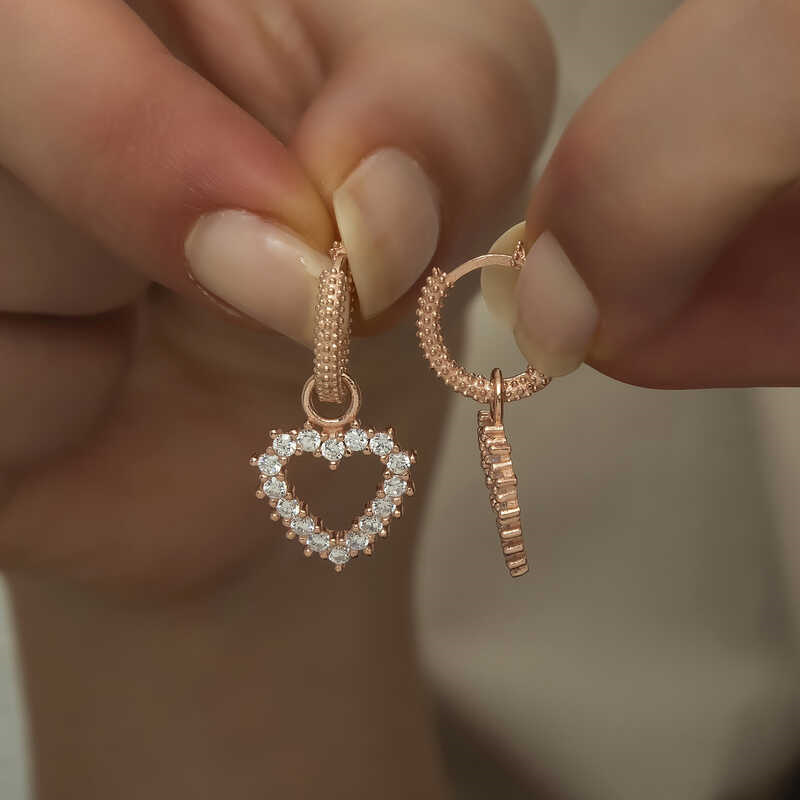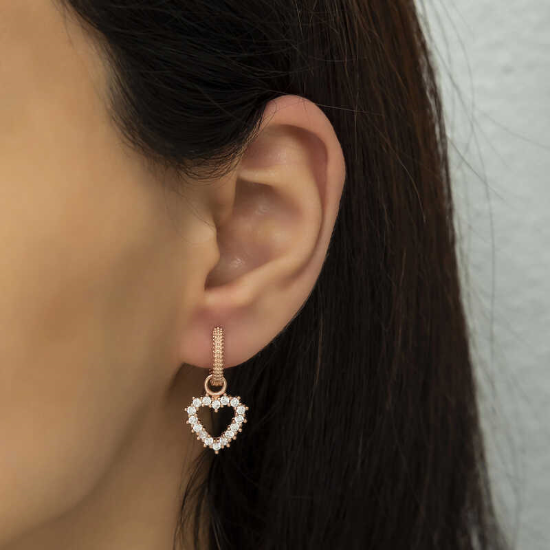 Silver Hoop Heart Women's EarringsThis wonderful design heart earring model, with all the stones in the heart pattern, is made of 925 sterling silver. Heart-designed earrings evoke love. Therefore, silver earrings can also be a nice gift option. Zircon stones are used on these earrings. Rose plated silver is used to delay oxidation and preserve its shine for a long time. This women's heart earring model is handmade like other silver women's heart earring models. Due to silver and precious stones, there may be ± 10% deviation in the average product weight.Width: 1.40 cmLength: 2.70 cmAvg. Weight: 4.35 gr.