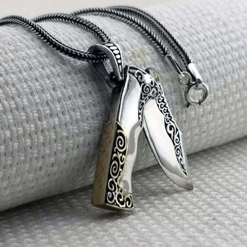 Silver Hunting Knife Men's Necklace A hunting knife is a sharp and durable blade specially designed for hunters. One of the most important equipment in hunting is the hunting knife. The hunting knife is a hunter's best friend. A hunting knife is useful for many purposes such as skinning the game animal, cutting its meat, boning it, starting a fire, cutting rope. This necklace is made of 925 sterling silver. Oxidized silver is coated. Silver necklace models with oxide coating preserve their shine for a long time and oxidation is delayed. This hunting knife necklace, like other silver necklace models, is produced by hand. Due to silver and precious stones, there may be ± 10% deviation in the specified product weight. Blade Width: 1.20 cm. Blade Open Length: 5.40 cm. Chain Length: 55 cm. Average Weight: 14.50 gr.