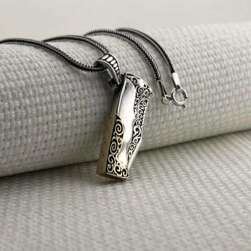 Silver Hunting Knife Men's Necklace A hunting knife is a sharp and durable blade specially designed for hunters. One of the most important equipment in hunting is the hunting knife. The hunting knife is a hunter's best friend. A hunting knife is useful for many purposes such as skinning the game animal, cutting its meat, boning it, starting a fire, cutting rope. This necklace is made of 925 sterling silver. Oxidized silver is coated. Silver necklace models with oxide coating preserve their shine for a long time and oxidation is delayed. This hunting knife necklace, like other silver necklace models, is produced by hand. Due to silver and precious stones, there may be ± 10% deviation in the specified product weight. Blade Width: 1.20 cm. Blade Open Length: 5.40 cm. Chain Length: 55 cm. Average Weight: 14.50 gr.