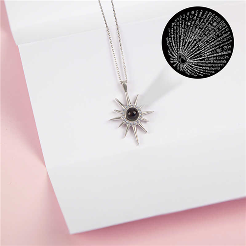 Silver I Love You in 100 Languages Polar Star Women's Necklace Designed for those who combine two meanings and say I love you in every language, the silver necklace with I love you in 100 languages will be one of the most stylish and meaningful accessories that will represent you and your loved one. The stone in the middle of the necklace contains the words I love you in 100 different languages. This text can be reflected and seen in a dark environment with light. By aiming your phone's flash on the round area in the image in a dark environment, you can project the words I love you in 100 languages on the wall like a projection. You can examine this feature of the product in the other image. This stylish silver I love you in 100 languages necklace is a perfect option as a birthday gift, Valentine's Day gift or a gift for mothers on special occasions. I love you in 100 languages necklace with silver zircon stones is made of 925 sterling silver. This ring is rhodium plated. Rhodium-plated silver "I love you in 100 languages" women's necklace models preserve their shine for a long time. The stones on them are zircon. Like all silver women's ring models, the "I love you in 100 languages" women's necklace model is also handmade. Due to silver and precious stones, there may be a ± 10% deviation from the average product weight. Width: 1.80 cm Length: 2.70 cm Average Weight: 2.90 gr.
