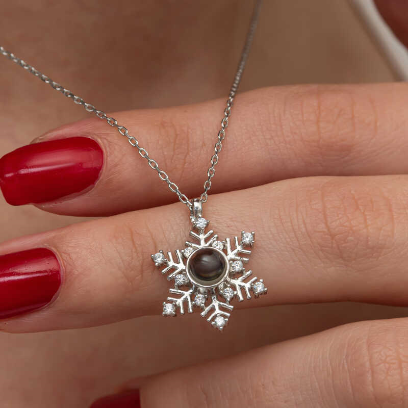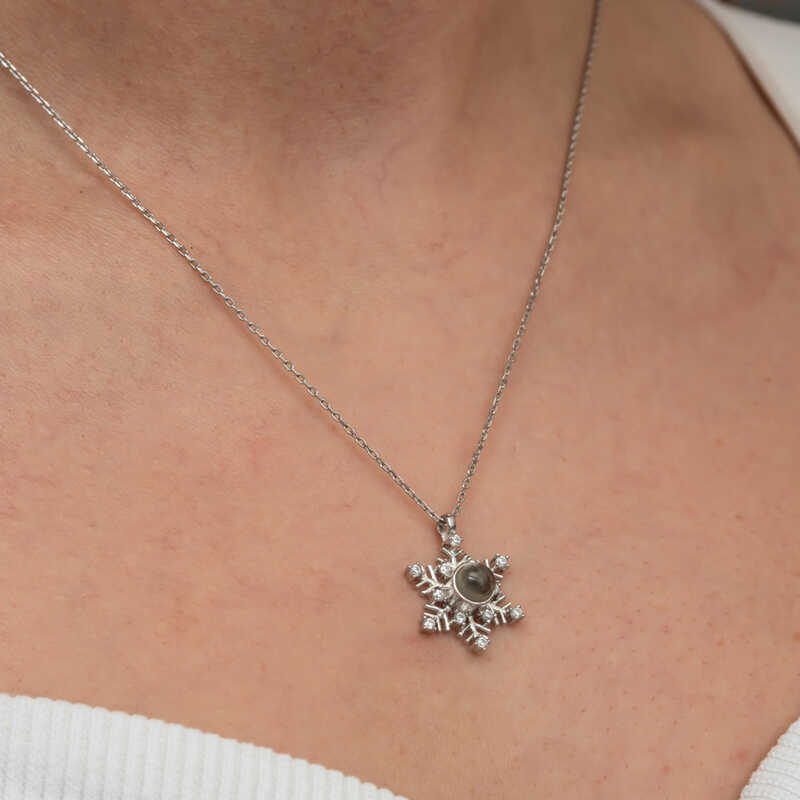 Silver I Love You in 100 Languages Snowflake Women's Necklace Designed for those who combine two meanings and say I love you in every language, the silver necklace with I love you in 100 languages will be one of the most stylish and meaningful accessories that will represent you and your loved one. The stone in the middle of the necklace contains the words "I love you" in 100 different languages. This text can be reflected and seen in a dark environment with light. You can project the words "I love you" in 100 languages on the wall by aiming your phone's flash on the round area in the visual in a dark environment. This stylish silver I love you in 100 languages snowflake necklace is a perfect option for a birthday gift, Valentine's Day gift or a gift for mothers on special occasions. It is made of 925 sterling silver. This ring is rhodium plated. Rhodium plated silver "I love you in 100 languages" women's necklace models preserve their shine for a long time. The stones on it are zircon. Like all silver women's necklace models, the silver 100 languages I love you women's necklace model is also handmade. Due to silver and precious stones, there may be a ± 10% deviation from the average product weight. Width: 1.50 cm Length: 2.50 cm Average Weight: 3.00 gr. Chain Length: 45.00 cm