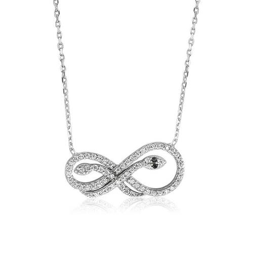 Silver Infinity Snake Women's Necklace Reflect your eternal love for those you have with the infinity symbol. This necklace, which your loved ones will enjoy wearing as much as you, will also be a different gift to share your love. The infinity snake women's necklace is made of 925 sterling silver. Rhodium plating is applied to the silver. Rhodium-plated silver women's necklace models preserve their shine for a long time and oxidation is delayed. The white and black stones on the necklace are zircon. The silver chain length is approximately 45 cm. This specially designed infinity snake women's necklace model is handmade like all other silver women's necklace models. Due to silver and precious stones, there may be a ± 10% deviation in the specified product weight.Width: 2.00 cmLength: 0.90 cmAverage Weight: 2.80 gr