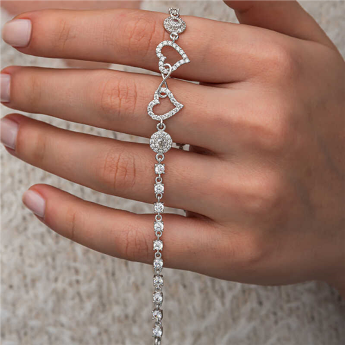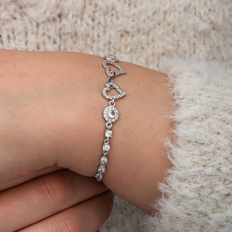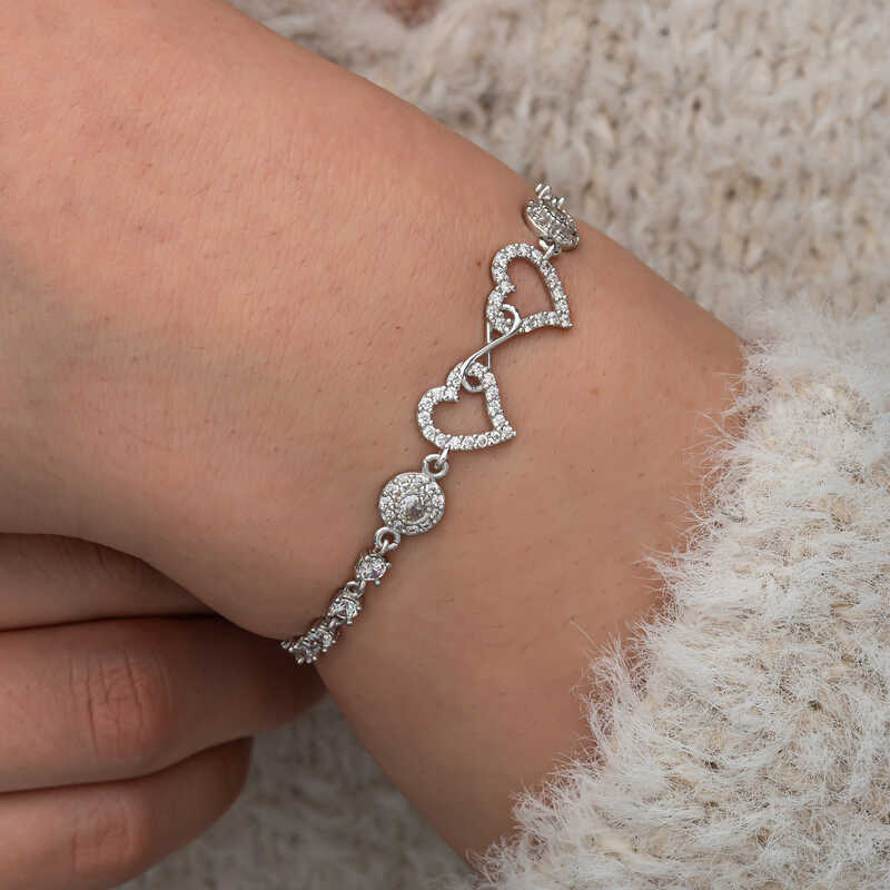 Silver Infinity Two Hearts Women's Bracelet The two heart figures represent a loving bond and the deep devotion of two people to each other. The infinity symbol emphasizes that this bond is not limited by time, but is eternal. With this specially designed silver bracelet that you will gift to your lover, you can express your eternal love and affection for him/her and give the message that you will be together forever. The infinity two heart bracelet that you can use on daily and special occasions is made of 925 sterling silver. Rhodium plated on silver. As with all silver bracelets, the silver infinity two heart women's bracelet model is also handmade. Due to silver and precious stones, there may be ± 10% deviation in the specified product weight. Width: 2.50 cm Length: 1.00 cm Bracelet Length: 21 cm Avg. Weight: 5.00 gr.