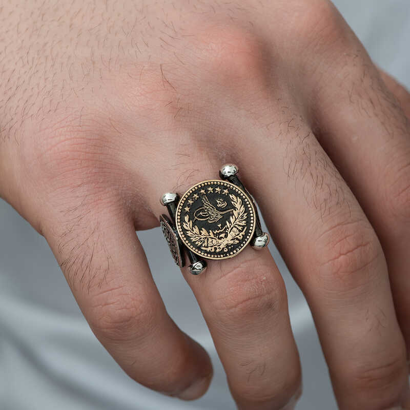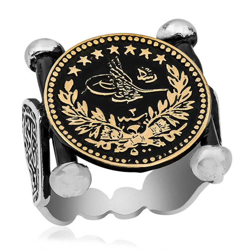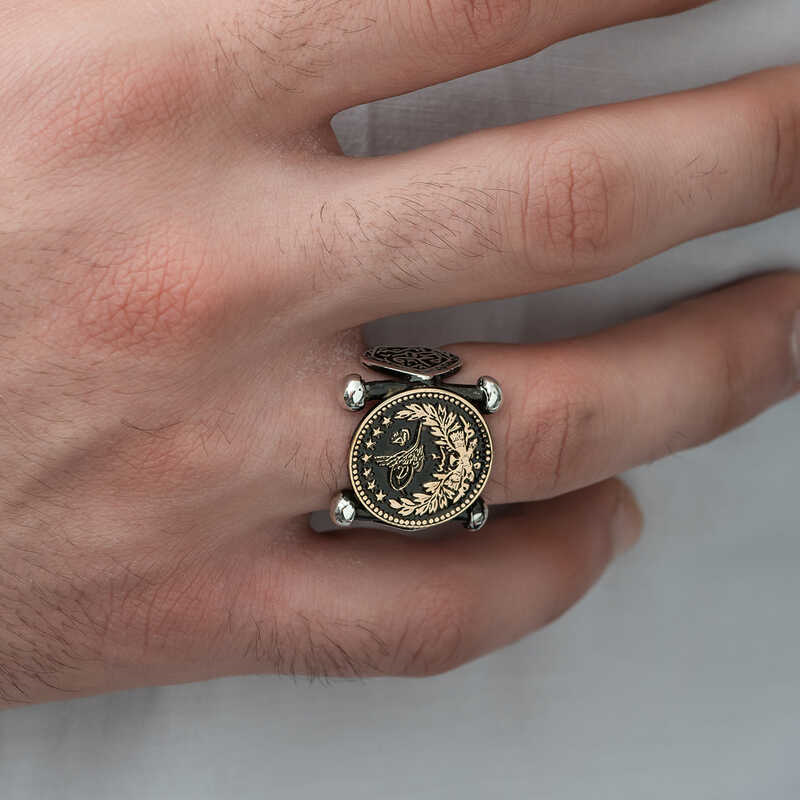 Silver Kadem-i Şerif Detailed Ottoman Tughra Men's RingKademi Şerif is another name for the nal-ı Şerif. Kademi Şerif is the clog-shaped sandal worn by Hz. Muhammad (pbuh). Today, Kademi Şerif has become one of the symbols of our Prophet (pbuh). Tughra means the signature of the Ottoman sultans. Each tugra expresses the name, existence, and reign of the sultan to whom it belongs. The tugra symbol has survived to the present day in many forms, different for each sultan. The tugra was preserved in every period of the Ottoman Empire and never lost its importance. And over time, it has an important place in our calligraphy, and is kept alive artistically by calligraphers today. You can enjoy this silver ring that reflects religion and art and gift it to your loved ones. Kademi Şerif detailed Ottoman Tughra men's ring is made of 925 sterling silver. The silver is oxidized. Oxide-coated silver women's rings preserve their shine for a long time. All silver rings are handmade. Due to silver and precious stones, there may be a ±10% deviation from the stated average product weight.Width: 2.00 cmLength: 2.00 cmAverage Weight: 9.70 gr.