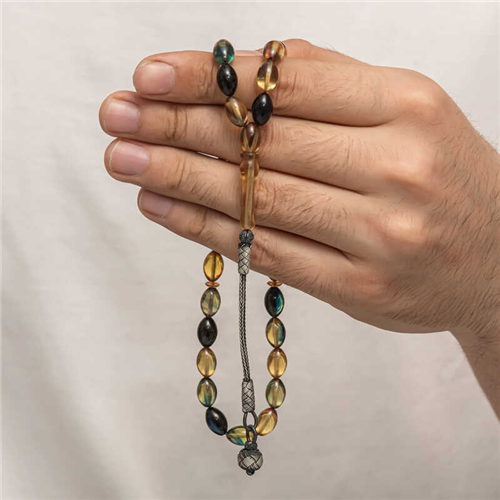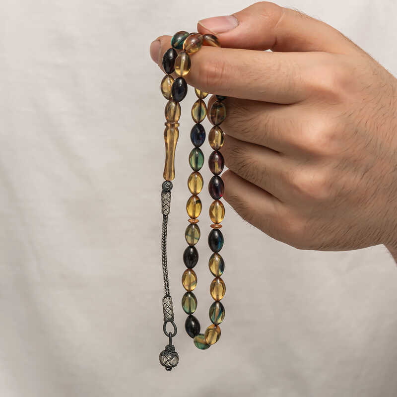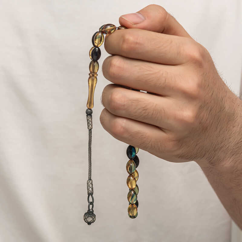 Silver Kazaz Tasseled Pressed Amber Prayer Beads Amber is a substance formed by the accumulation of pine tree resin underground over many years. It is almost the same hardness as stone, but its density is lower. It emits a pine scent. It is a valuable substance because its formation takes a long time and cannot be made artificially. Pressed amber, on the other hand, is a material that bears the characteristics of amber, resembles it in appearance but is not real. Various materials have been produced from amber in our country and in many parts of the world. Prayer beads are the most commonly produced in our country. Amber prayer beads give off an amber-like scent and change color as they are warmed in the hand. They come in many colors. There are even amber prayer beads that are a combination of two colors. They are usually used with a silver tassel or can be used systematically. Our country's distinguished rosary masters frequently craft this material to create various works of art. These rosaries are also bought and sold by collectors. The 1000-karat silver-plated amber rosary with a tassel is a very elegant rosary suitable for everyday use. A must-have gift for special occasions, these amber rosaries are a perfect gift for men on special occasions like birthdays, Valentine's Day, and Father's Day. The silver tasseled squeezed amber prayer beads model is manufactured entirely by hand, as are other amber prayer beads models. Bead Width: 0.80 cm Bead Length: 1 cm Prayer Length: 30 cm Average Weight: 15.50 gr