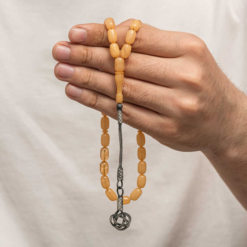 Silver Kazaz Tasseled Pressed Amber Prayer Beads Amber is a substance formed by the accumulation of pine tree resin underground over many years. It is almost the same hardness as stone, but its density is lower. It emits a pine scent. It is a valuable substance because its formation takes a long time and cannot be made artificially. Pressed amber, on the other hand, is a material that bears the characteristics of amber, resembles it in appearance but is not real. Various materials have been produced from amber in our country and in many parts of the world. Prayer beads are the most commonly produced in our country. Amber prayer beads give off an amber-like scent and change color as they are warmed in the hand. They come in many colors. There are even amber prayer beads that are a combination of two colors. They are usually used with a silver tassel or can be used systematically. Our country's distinguished rosary masters frequently craft this material to create various works of art. These rosaries are also bought and sold by collectors. The 1000-karat silver-plated amber rosary with a tassel is a very elegant rosary suitable for everyday use. A must-have gift for special occasions, these amber rosaries are a perfect gift for men on special occasions like birthdays, Valentine's Day, and Father's Day. The silver tasseled squeezed amber prayer beads model is manufactured entirely by hand, as are other amber prayer beads models. Bead Width: 0.80 cm Bead Length: 1 cm Prayer Length: 30 cm Average Weight: 18 gr