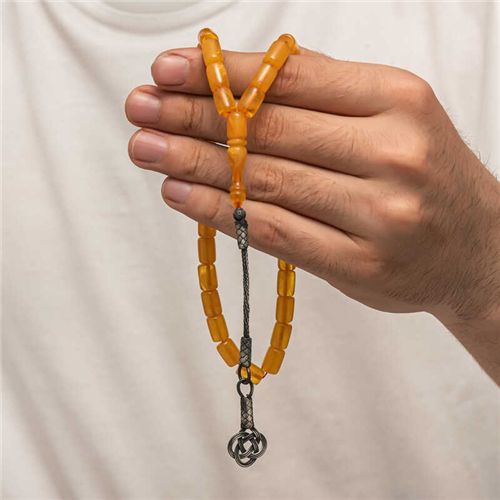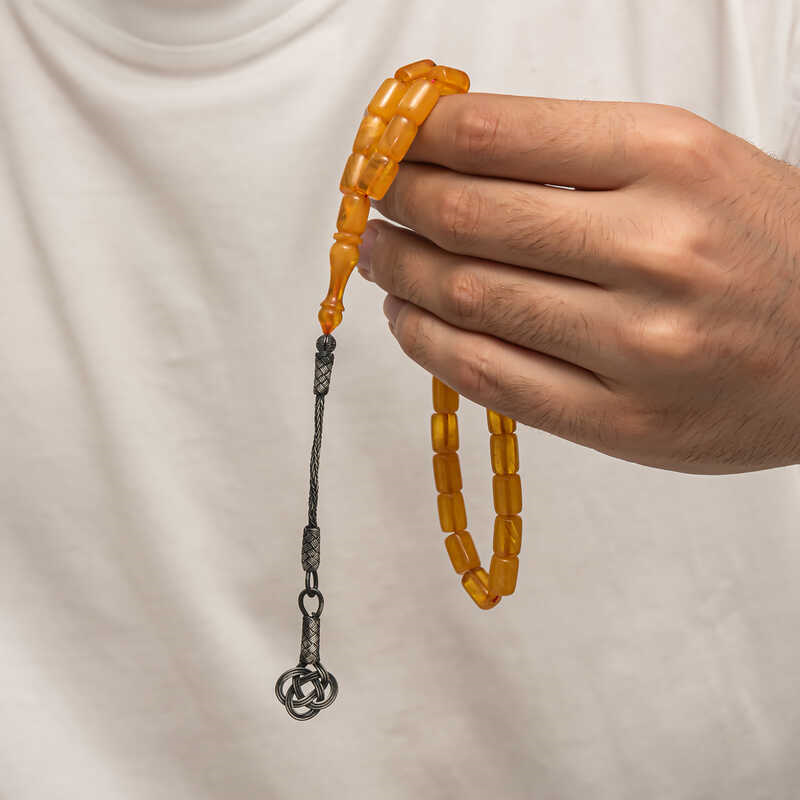 Silver Kazaz Tasseled Pressed Amber Prayer Beads Amber is a substance formed by the accumulation of pine tree resin underground over many years. It is almost the same hardness as stone, but its density is lower. It emits a pine scent. It is a valuable substance because its formation takes a long time and cannot be made artificially. Pressed amber, on the other hand, is a material that bears the characteristics of amber, resembles it in appearance but is not real. Various materials have been produced from amber in our country and in many parts of the world. Prayer beads are the most commonly produced in our country. Amber prayer beads give off an amber-like scent and change color as they are warmed in the hand. They come in many colors. There are even amber prayer beads that are a combination of two colors. They are usually used with a silver tassel or can be used systematically. Our country's distinguished rosary masters frequently craft this material to create various works of art. These rosaries are also bought and sold by collectors. The 1000-karat silver-plated amber rosary with a tassel is a very elegant rosary suitable for everyday use. A must-have gift for special occasions, these amber rosaries are a perfect gift for men on special occasions like birthdays, Valentine's Day, and Father's Day. The silver tasseled squeezed amber prayer beads model is manufactured entirely by hand like other amber prayer beads models. Bead Width: 0.80 cm Bead Length: 1 cm Prayer Length: 30 cm Average Weight: 19 gr