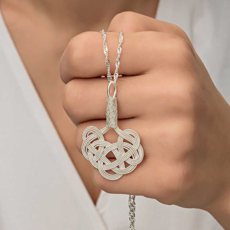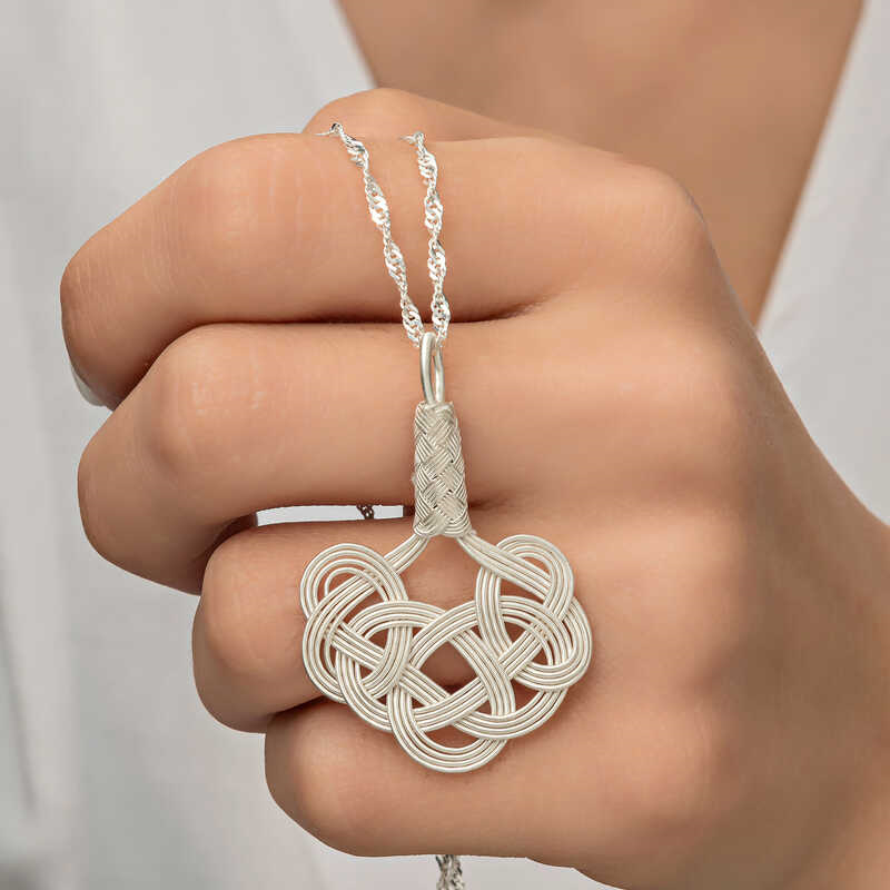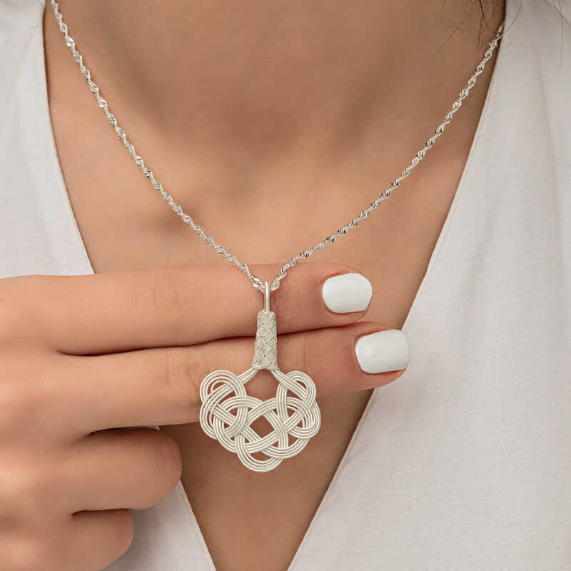 Silver Kazaziye Knitted Women's Necklace Kazaziye, kazazlık or kazaz; is a handicraft made from pure silver wires using knitting techniques. It is used in prayer beads and can also be made as a bracelet or necklace. A knitted Kazaziye necklace is completely handmade. For those who want to achieve a stylish look, the Kazaziye knitted necklace that will never go out of style is waiting for you. A silver knitted Kazaziye necklace is a perfect option for a birthday gift, Valentine's Day gift or for special occasions. The silver necklace is made of 1000 carat pure silver and is 100% handcrafted. The silver is oxidized. Due to silver and precious stones, there may be a ± 10% deviation in the average product weight. Necklace Width: 3.00 cm Necklace Length: 4.50 cm Chain Length: 45 cm Average Weight: 5.30 gr.