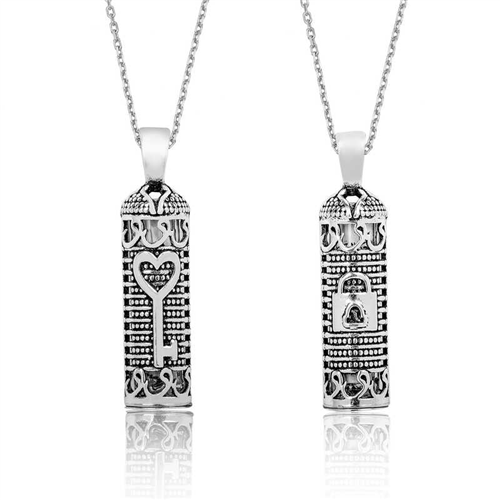 Silver Key Cevşen Prayer Cylinder Necklace The cevşen necklace, which is a spiritual armor for people, can be chosen as a birthday gift, Valentine's Day gift or a gift for mothers on special occasions. The cevşen prayer cylinder women's necklace model is made of 925 sterling silver. Oxidized silver is coated. Oxidized silver necklaces preserve their shine for a long time and oxidation is delayed. Like all necklaces, this silver cevşen prayer cylinder necklace is also produced entirely by hand. Due to silver and precious stones, there may be a ± 10% deviation from the average product weight. Necklace Width: 0.80 cm Necklace Length: 3.30 cm Chain Length: 45 cm Average Weight: 6.30 gr.