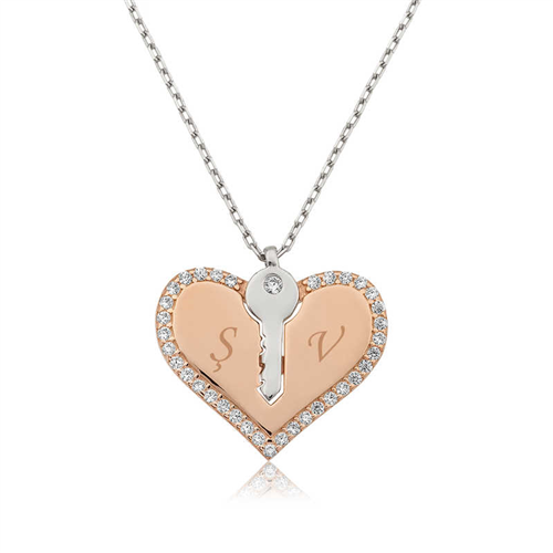 Silver Key to My Heart Necklace The key, as it is known, is a symbol with esoteric interpretations based on the actions of opening and closing and therefore revealing what is hidden or keeping what is secret secret. The key located inside the heart means that you have given the key to your heart to the person you love. Adorn your loved one's neck with love with this special necklace that young lovers can choose on special occasions... This necklace, on which the initials of the lovers' names are written that you and your loved ones will enjoy wearing, will be one of the most meaningful gifts. The silver is rose plated. Rose plated silver women's necklaces preserve their shine for a long time and oxidation is delayed. Like all women's silver necklaces, the silver Key to My Heart women's necklace is hand-crafted. Due to silver and precious stones, there may be ± 10% deviation in the specified product weight. Width: 1.80 cm Length: 1.50 cm Average Weight: 2.30 Gr. Chain Length: 45 cm