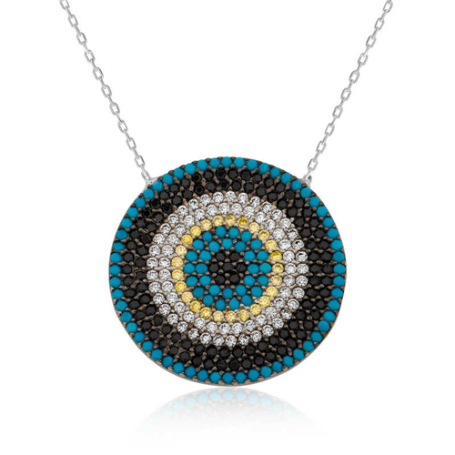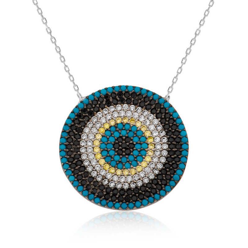 Silver Large Evil Eye Bead Women's Necklace Various talismans have been used in many cultures to protect against the harms of bad energy. The talisman used in most Eastern cultures is the eye. The evil eye bead is also inspired by the shape of the eye. The choice of blue color is no coincidence. Evil eye beads are mostly designed in blue due to the belief that people with colored eyes reflect their energy more effectively. You can gift this dazzlingly beautiful silver evil eye bead necklace to those you want to protect from the evil eye and to your loved ones. All of our products are handmade. Due to silver and precious stones, there may be ± 10% deviation in product weight. Width: 2.50 cm Length: 2.50 cm Weight: 5.20 gr.
