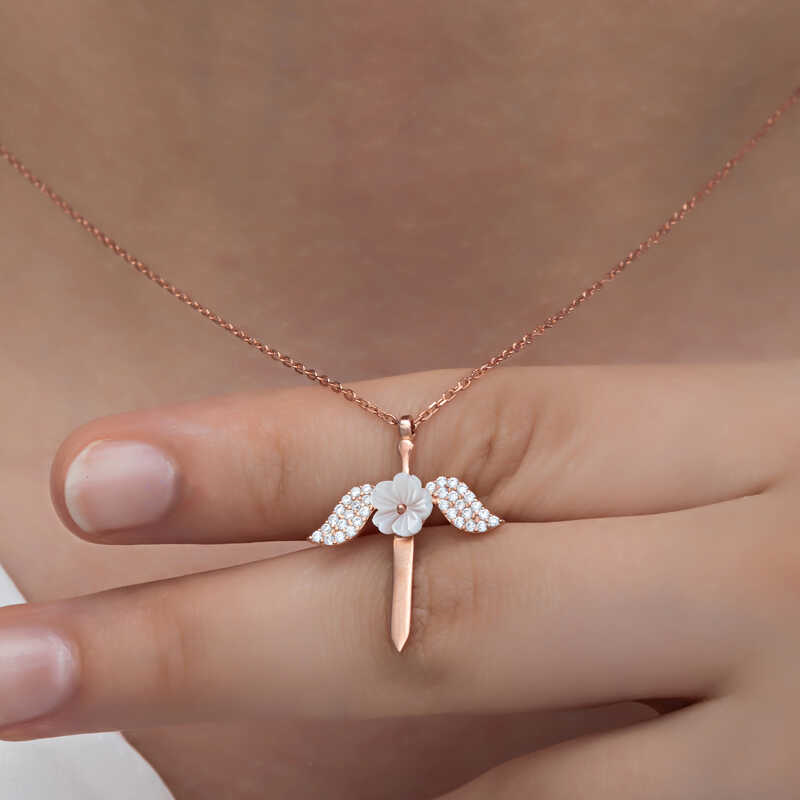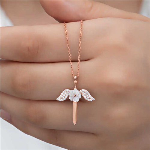 Silver Magnolia Flower Angel Woman Necklace Angels are symbols of purity and cleanliness. Therefore, the person who is given an angel necklace is given the message that he or she is as pure and clean as an angel. You can make your lover happy by gifting this special magnolia flower angel woman necklace, designed for the protection of angels, on his or her birthday, Valentine's Day or special occasions. The necklace is made of 925 sterling silver. The silver angel woman necklace is rhodium plated. All necklaces with rhodium plating preserve their shine for a long time and give the silver a pink color. As with all silver necklaces, this silver magnolia flower angel woman necklace is also handmade. Due to silver and precious stones, there may be ± 10% deviation in the weight of the product. Width: 2.00 cm. Height: 2.50 cm. Weight: 2.30 gr.