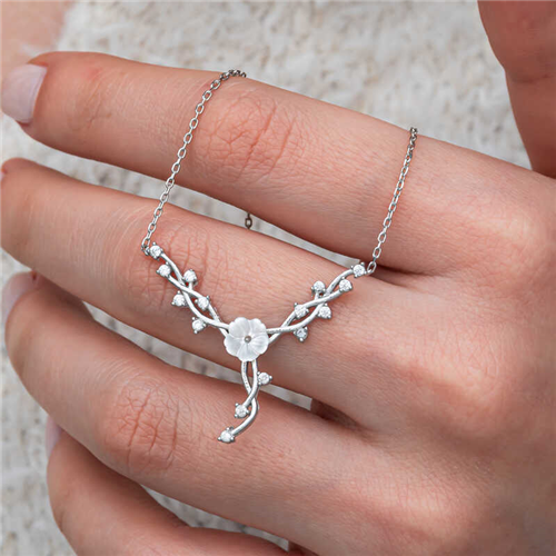 Silver Magnolia Flower Ivy Women's Necklace Magnolia symbolizes elegance and beauty. This flower is also associated with love and passion. It is a flower that generally symbolizes the beginning of spring, therefore it also carries feelings of innovation and hope. Ivy, with its ability to grow and spread, also includes concepts of devotion and loyalty. It also symbolizes strong durability. This stylish necklace is a perfect option for a birthday gift, Valentine's Day or special occasions. The necklace is made of 925 sterling silver. Rhodium plated on the silver. Due to silver and precious stones, there may be ± 10% deviation from the average product weight. Width: 3.00 cm Length: 2.50 cm Avg. Weight: 3.00 gr. Chain Length: 45.00 cm