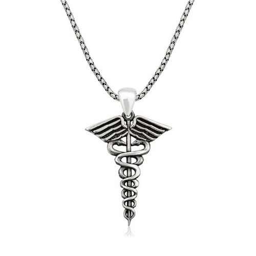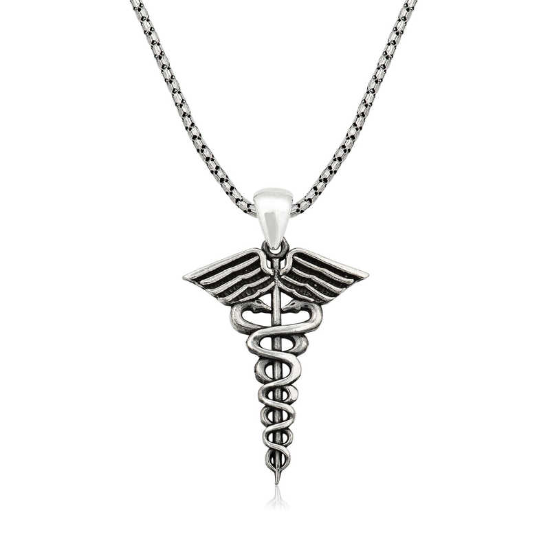 Silver Medical Symbol Caduceus Necklace The staff symbol of Hermes, the messenger god in Greek mythology (Mercury in Roman mythology), with two wings on top and two intertwined snakes around it. As the symbol of medicine wrapped around Hermes' double-snake staff called the Caduceus, the opposite powers of healing and poison and resurrection are seen. It is believed that the staff has the power to create fire, put people into deep sleep, anesthetize, transmit dreams, etc. and has the power of reconciliation. It depicts the wheel of time and fate. This dazzling necklace with its stylish design is made of 925 sterling silver. Oxidized silver is coated. Products with oxidized coating have a black antique appearance. Like all silver necklaces, this necklace is entirely hand-crafted. Due to silver and precious stones, there may be ± 10% deviation in product weight. Width: 2.30 cm Length: 3.00 cm Average Weight: 10.60 gr. Chain Length: 55 cm.