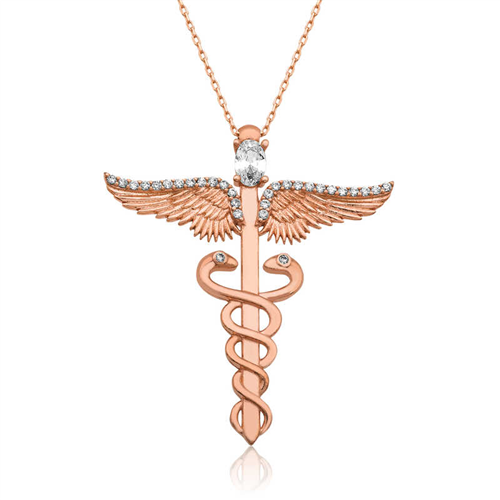 Silver Medicine Symbol Caduceus Women's Necklace The staff symbol of Hermes, the messenger god in Greek mythology (Mercury in Roman mythology), with two wings on top and two intertwined snakes around it. As the symbol of medicine wrapped around Hermes' double snake staff called Caduceus, the opposite powers of healing and poison and resurrection are seen. It is the staff that is believed to have the power of reconciliation, capable of creating fire, putting people into deep sleep, anesthetizing, transmitting dreams etc. It depicts the wheel of time and fate. This dazzling necklace model with its sparkling and different design is made of 925 sterling silver. Rose gold plated on silver. Rose gold plated silver necklaces preserve their shine for a long time and oxidation is delayed. The white stones on the necklace are zircon. Like all silver necklaces, this necklace model is also produced entirely by hand. Due to silver and precious stones, there may be a ± 10% deviation in the average product weight. Width: 3.70 cm Length: 4.00 cm Weight: 4.80 gr.