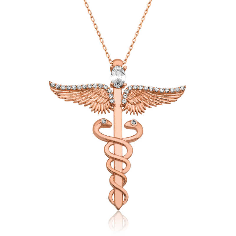 Silver Medicine Symbol Caduceus Women's Necklace The staff symbol of Hermes, the messenger god in Greek mythology (Mercury in Roman mythology), with two wings on top and two intertwined snakes around it. As the symbol of medicine wrapped around Hermes' double snake staff called Caduceus, the opposite powers of healing and poison and resurrection are seen. It is the staff that is believed to have the power of reconciliation, capable of creating fire, putting people into deep sleep, anesthetizing, transmitting dreams etc. It depicts the wheel of time and fate. This dazzling necklace model with its sparkling and different design is made of 925 sterling silver. Rose gold plated on silver. Rose gold plated silver necklaces preserve their shine for a long time and oxidation is delayed. The white stones on the necklace are zircon. Like all silver necklaces, this necklace model is also produced entirely by hand. Due to silver and precious stones, there may be a ± 10% deviation in the average product weight. Width: 3.70 cm Length: 4.00 cm Weight: 4.80 gr.