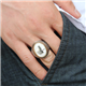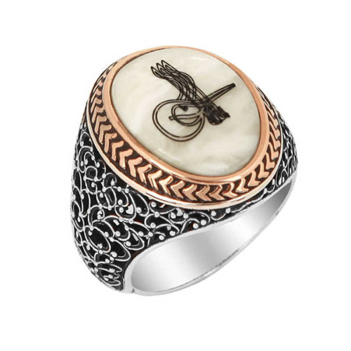 Silver Men's Ring with Tughra on Mother-of-PearlMother-of-pearl is a sparkling and hard substance found in the shells of marine creatures such as oysters and mussels. Mother-of-pearl is a stone of organic origin. It is mined in many Far Eastern countries such as China and India, but it can also be mined from any country with seas and oceans. Mother-of-pearl is a stone that can be found on land as a fossil remains. This stone is one of the rare stones mined both from the sea and land. Because it is the shell of a living creature, it contains abundant organic matter. Mother-of-pearl is widely used as jewelry and ornamentation. It is usually found in white and slightly off-yellow colors. Tughra is a symbol or signature that includes the sultan's name and nickname. Tughra is a branch of calligraphy and has been written by master calligraphers for centuries. In Turkish, the word means a special sign containing the sultan's name, or the sultan's signature. The original name, "tuğra" in the Oghuz dialect, means the printed signature of the ruler. The ring is made of 925 sterling silver. The silver is oxide-coated, and the stone on it is mother-of-pearl. All of our products are handmade. Due to the silver and precious stones, there may be a ±10% deviation in product weight.Average Weight: 16.00 gr.