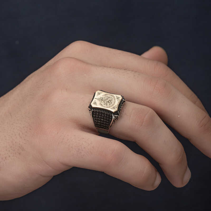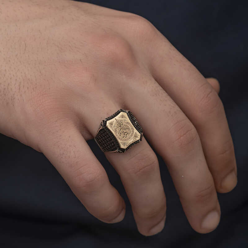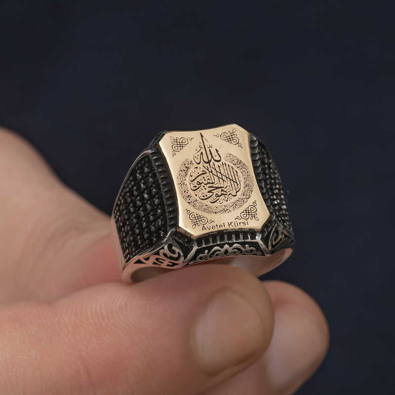 Men's Ring with Ayetel Kursi Inscription in SilverAyetel Kursi is the 255th verse of the Surah Al-Baqarah, the 2nd chapter of the Quran. In other words, Ayetel Kursi is a verse in the Quran. It takes its name from the word "kursiyuhus samawati" (thus the word kursi) in the verse. This prayer can be recited after the Fatiha in prayer or for the purpose of glorifying or supplicating Allah. The Virtue of Ayetel Kursi; There is no god but Allah, the Ever-Living, the Self-Subsisting. Neither sleep nor slumber comes to Him. To Him belongs everything in the heavens and the earth. And who can intercede with Him except with His permission? He knows what His servants do and what they will do. (Nothing is hidden from Him.) People can not fully know anything of His knowledge except what He has revealed. His throne encompasses the heavens and the earth, and it is not difficult for Him to protect and watch over them. He is the Almighty, the Great. Men's Ring with Ayetel Kürsi Inscribed on turquoise stone is made of 925 sterling silver. Rhodium plated silver. Rhodium plated silver men's ring models preserve their shine for a long time and oxidation is delayed. Like the Silver Ayetel Kürsi Inscribed Men's Ring model, all silver men's ring models are handmade. Due to silver and precious stones, there may be ± 10% deviation from the average product weight.Width: 2.10 cmLength: 2.50 cmAvg. Weight: 11.5 gr.
