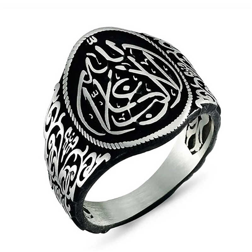 Silver La Galiba İllallah Written Men's Ring The La Galiba illallah men's ring model on silver is a stylish accessory that you can use at any time of the day. The phrase "La Galibe İllallah" is in the 21st verse of Surah Yusuf. The expression "La Galibe İllâllah" means "There is no winner but Allah." In verse 21 of Surah Yusuf, Allah says: " ...Allah is the victorious one in all His affairs, but most of the people do not know." Based on this verse, the statement "There is no winner but Allah." It is said that no matter how far the world has come or how successful it is, the true winner is Allah. Its spirituality is very deep and truly motivating. Everyone leaves, everything collapses, but the truth is unique. Even if you are not aware of it, It does not change. You can gift this ring to yourself or your loved ones on your birthday, Father's Day, or any special occasion. The men's ring with the inscription "La bence illallah" is made of 925 sterling silver. The silver is oxidized. Oxidized silver men's rings preserve their shine for a long time. Like all men's rings, the silver men's ring with the inscription "La illallah" is also handmade. Due to silver and precious stones, there may be a ±10% deviation from the average product weight.Width: 2.40 cmLength: 2.60 cmAverage Weight: 9 g.