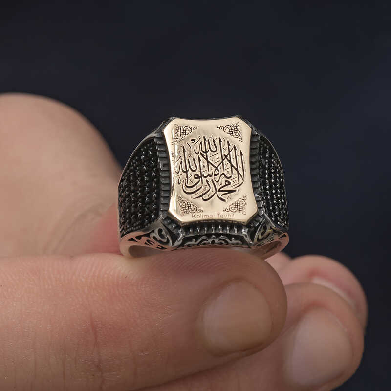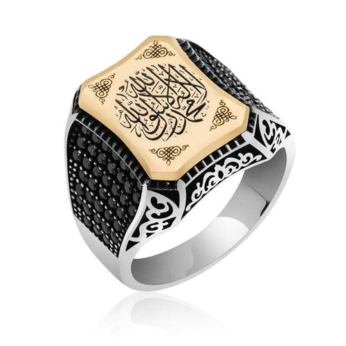Silver Kalima-i Tawhid Men's Ring"La Ilahe Illallah, Muhammadun Resulullah" means "There is no god but Allah. Hz. Muhammad (pbuh) is the Prophet of Allah." Kalima-i Tawhid men's ring is designed for you. This stylish ring model is made of 925 sterling silver. Oxidized silver is coated. Oxidized men's rings preserve their shine for a long time. The average length of the silver chain is 45 cm. As with all silver men's rings, the silver Kalima-i tawhid men's necklace model is also handmade. Due to silver and precious stones, there may be a ± 10% deviation from the average product weight.Width: 2.610 cmLength: 2.50 cmAverage Weight: 11.5 gr.