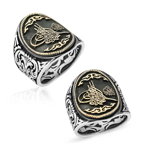 Silver Tughra Men's Ring with La Ilahe Illallah WrittenTughra is a symbol or signature that includes the sultan's name and epithet. Tughra is a branch of calligraphy that has been written by master calligraphers for centuries. In Turkish, it means a special sign containing the sultan's name, a signature of the sultan. The original word 'tughra' in the Oghuz dialect is 'tughra', which means the printed signature of the sultan. The first tughra used by Orhan Gazi consists of the expression 'Orhan bin Osman' and the first of the tughras is dated 1324 and 1348. A tughra belonging to Sultan Osman Gazi I has not been found anywhere to this day. Therefore, there are 36 Ottoman sultans, but 35 tughras of Ottoman sultans. The section where the sultan's name and his father's name are written is called the throne, rostrum, or sere. The section extending from here to the left, from bottom to top, consisting of two concentric curves, is called the beyze or sanjak. You can enjoy using this ring with the Tughra emblem symbolizing the Ottoman Empire and the inscription "La Ilahe Illallah" and gift it to your loved ones. It is made of 925 sterling silver. Silver is oxidized. Oxidized silver rings have an aged appearance and tarnishing is delayed. All of our products are hand-made. Due to silver and precious stones, there may be a ±10% deviation from the average product weight.Width: 2.00 cmLength: 2.50 cmAverage Weight: 15.12 gr.