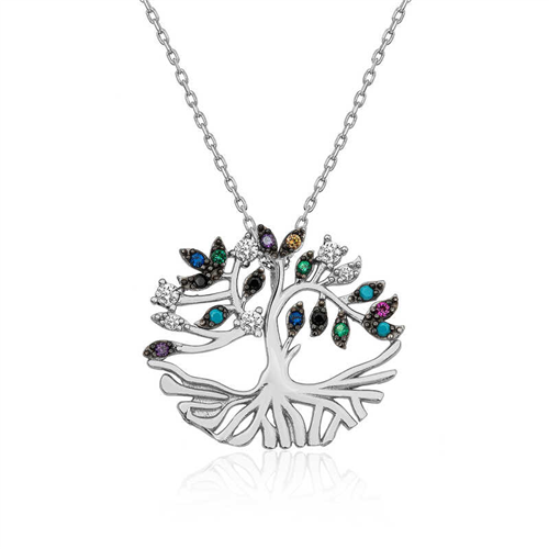 Silver Mixed Stone Tuba Tree Necklace The Tuba tree, while carrying meanings such as beauty, pleasantness, goodness, and the light of the eye, is also depicted as a tree in heaven. It is also mentioned several times in the Quran. Another narration states that this tree, thought to be in heaven, is so large that it could take centuries to walk under it. In yet another narration, it is said, "There is a tree in heaven; a rider riding a trained, swift horse could travel for a hundred years and not finish its shadow." There is a belief that everyone's desires come true under the tree's shade and that whatever they desire is available. Another belief is that it is unlike most trees in the world and that its fruits have unique flavors. It is also said to resemble a walnut tree. It is known to grow on a single trunk and extend forever upward. You can make a difference on special occasions with this meaningful necklace that can become a symbol of your love. Mixed stone tuba tree necklace is made of 925 sterling silver. The silver is rhodium plated. Like other necklaces, the silver mixed stone tuba tree women's necklace is also handmade. Due to silver and precious stones, there may be ± 10% deviation from the average product weight. Width: 2.20 cm Length: 2.00 cm Average Weight: 3.10 gr.