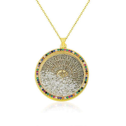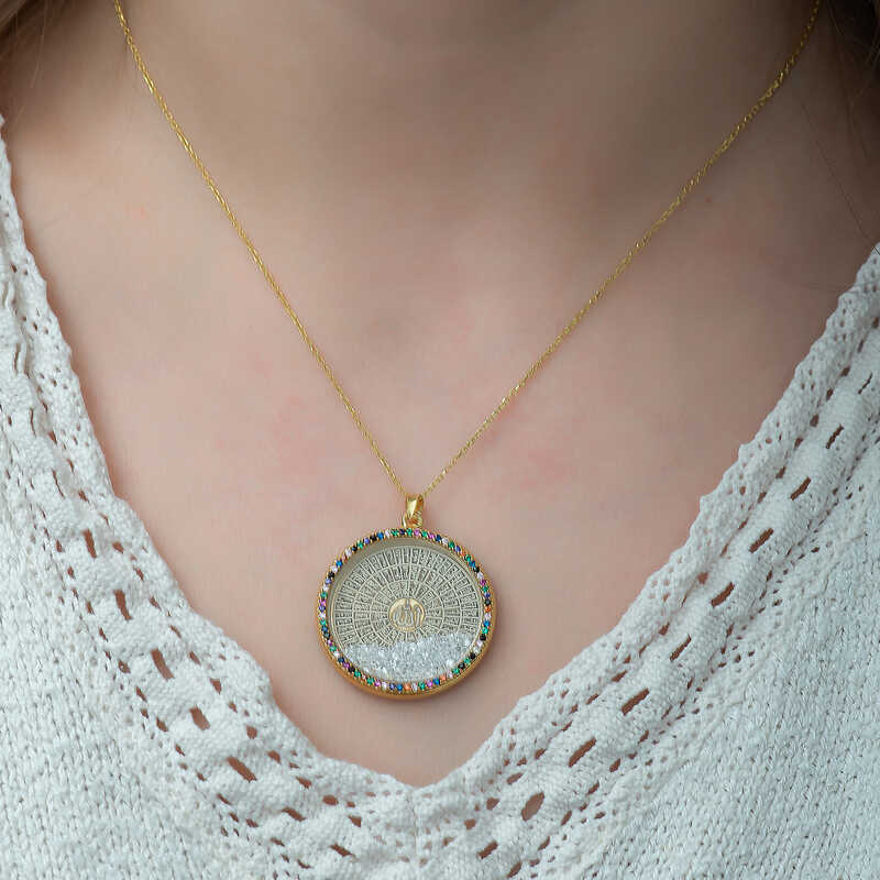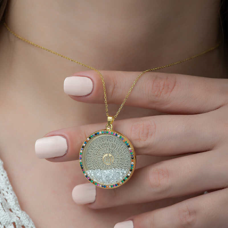 Esmaül Hüsna Women's Necklace with Mixed Stones Esmaül Hüsna is the name given to the ninety-nine names of Allah, which mean the most beautiful names. This wonderful necklace, on which Esmaül Hüsna is written and which has zircon stones inside and around it, is made of 925 sterling silver. Gold-plated silver. Gold-plated silver necklace models preserve their shine for a long time. The necklace chain is also silver and is 45 cm in length. This specially designed necklace is a perfect option for a birthday gift, Valentine's Day gift or a gift for mothers on special occasions. Like all our silver necklace models, the silver mixed stone Esmaül Hüsna necklace model is also handmade. Due to silver and precious stones, there may be a ± 10% deviation in the specified product weight. Width: 2.80 cm Length: 2.80 cm Average Weight: 10.10 gr.
